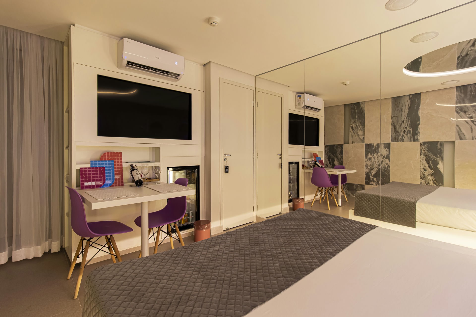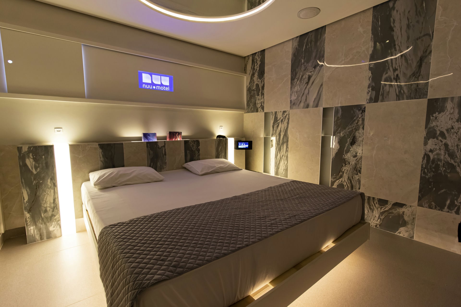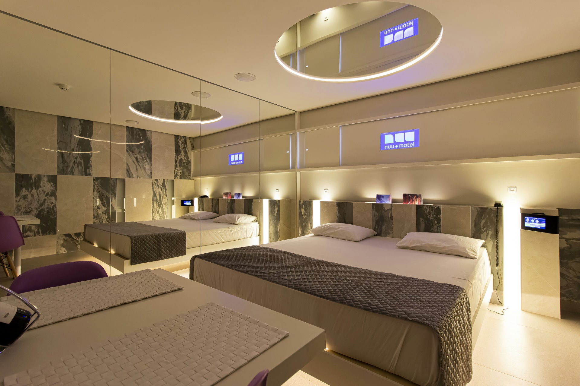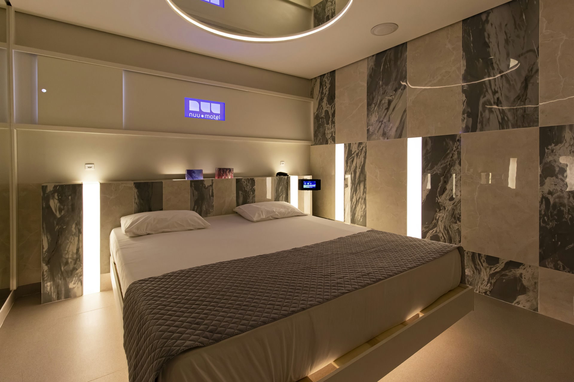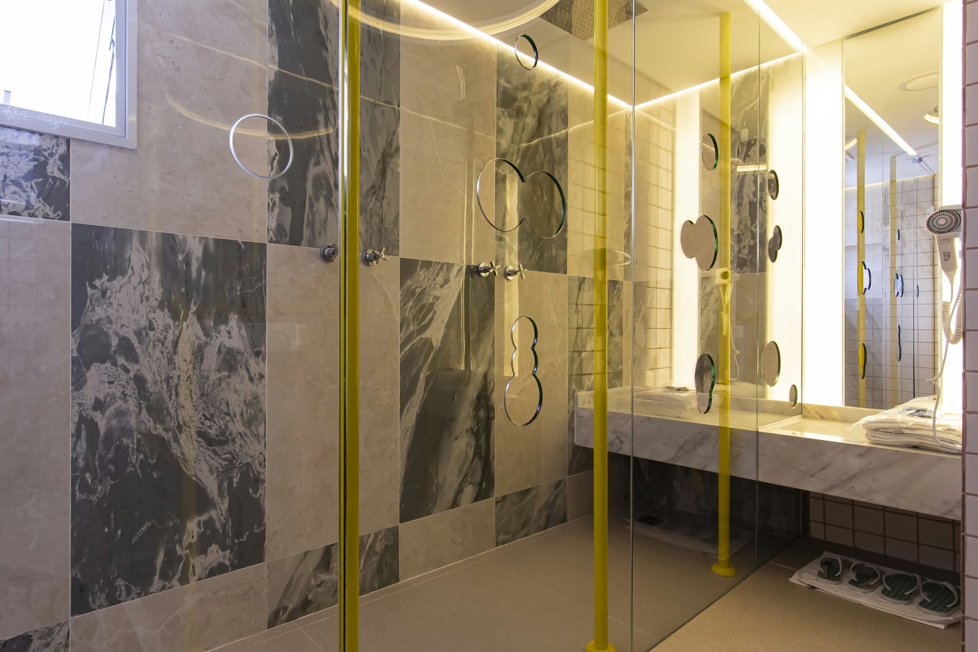 A suíte nuu.box tem esse nome não à toa: buscamos levar a sério a experiência dentro do chuveiro e possibilitar interações inusitadas. Se permitam descobrir os buracos junto dos seus corpos — aqui a gente quis subverter a ideia dos famosos “glory holes”, permitindo que outras partes dos corpos fossem colocadas em evidência: seios, nádegas, bocas, orelhas, pés. Um de frente para outro, separados por um vidro, um banco que sugere explorar ainda outras posições — tudo aqui serve de estímulo para vocês se aproveitarem.