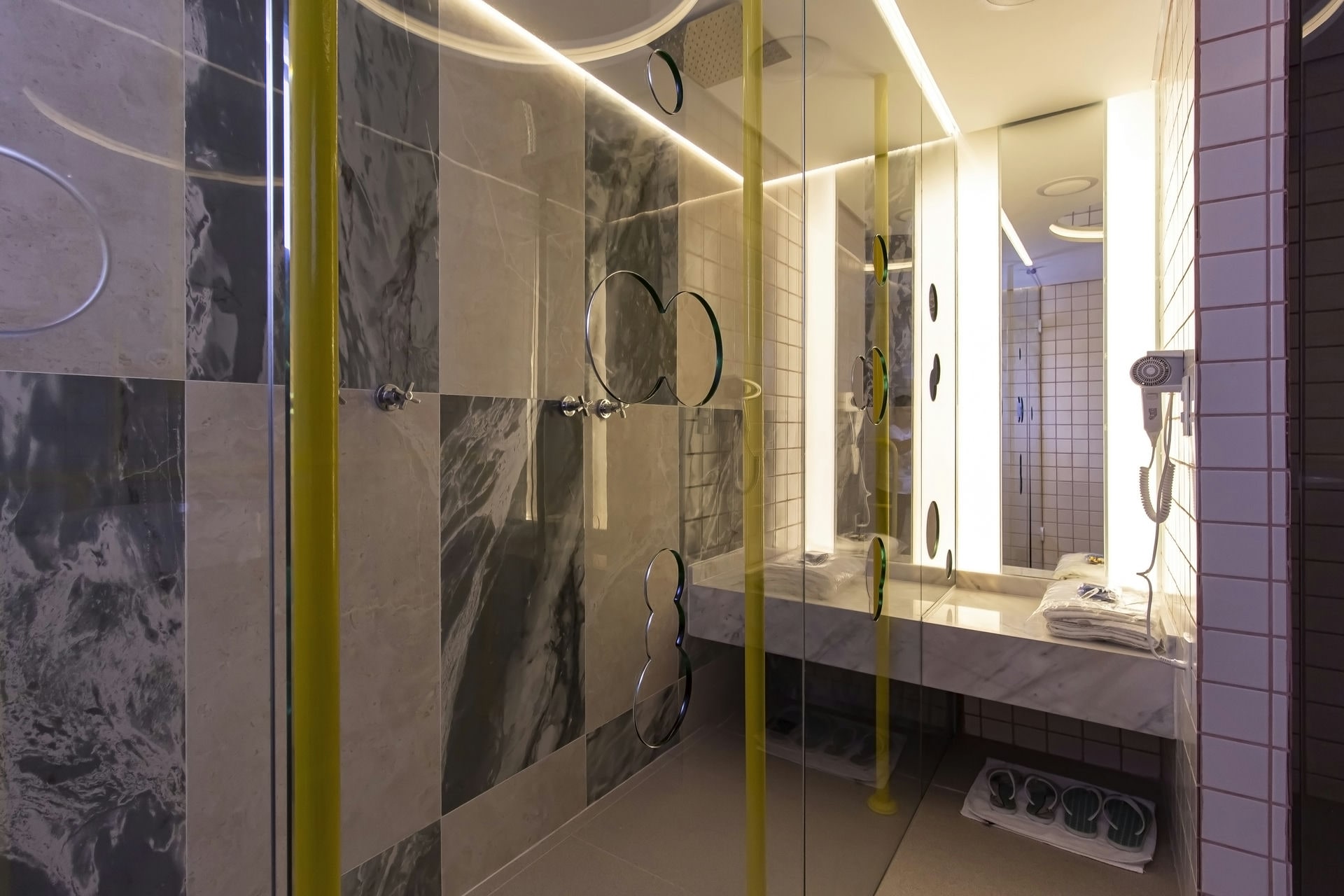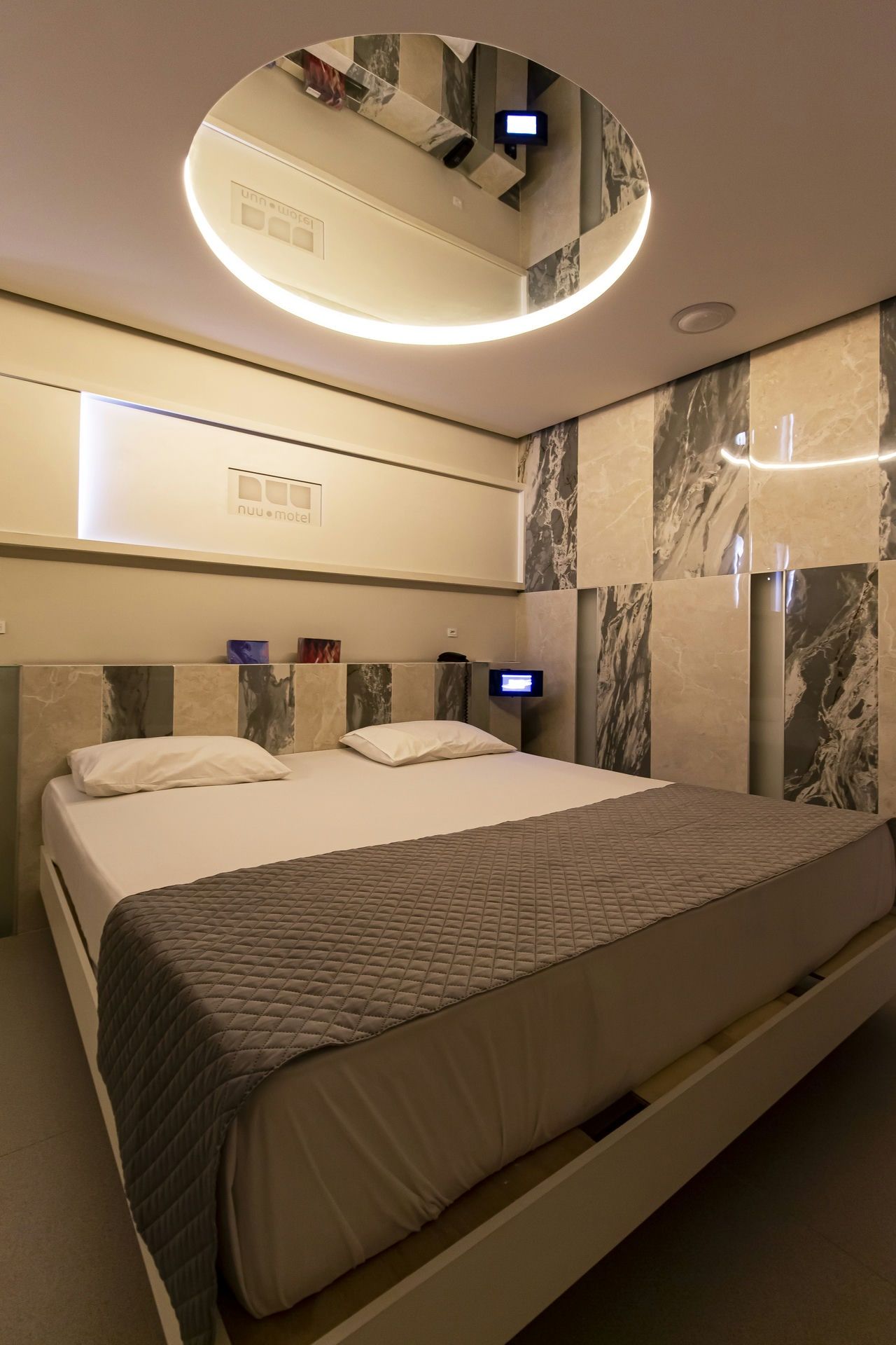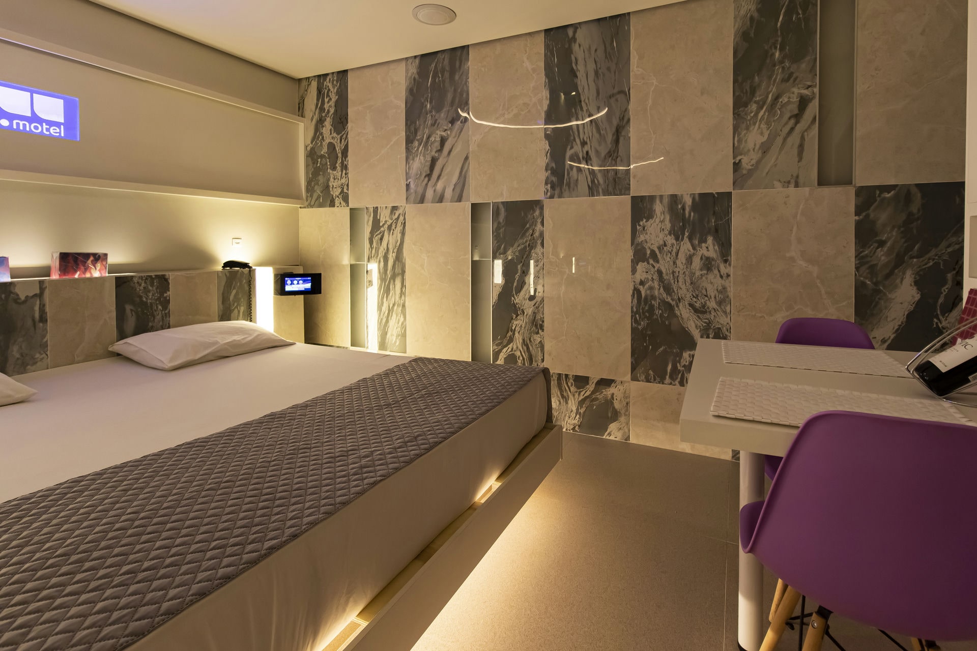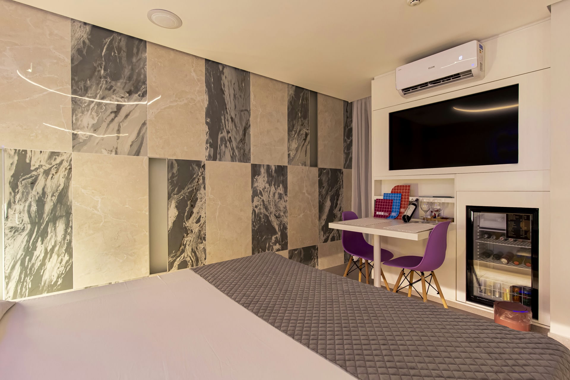 A suíte nuu.box tem esse nome não à toa: buscamos levar a sério a experiência dentro do chuveiro e possibilitar interações inusitadas. Se permitam descobrir os buracos junto dos seus corpos — aqui a gente quis subverter a ideia dos famosos “glory holes”, permitindo que outras partes dos corpos fossem colocadas em evidência: seios, nádegas, bocas, orelhas, pés. Um de frente para outro, separados por um vidro, um banco que sugere explorar ainda outras posições — tudo aqui serve de estímulo para vocês se aproveitarem.