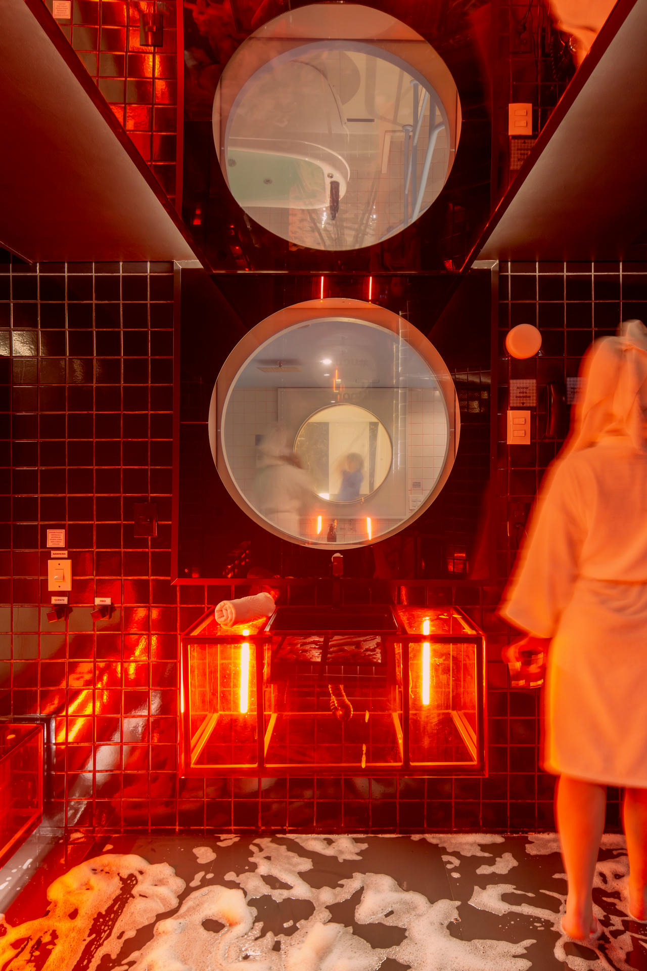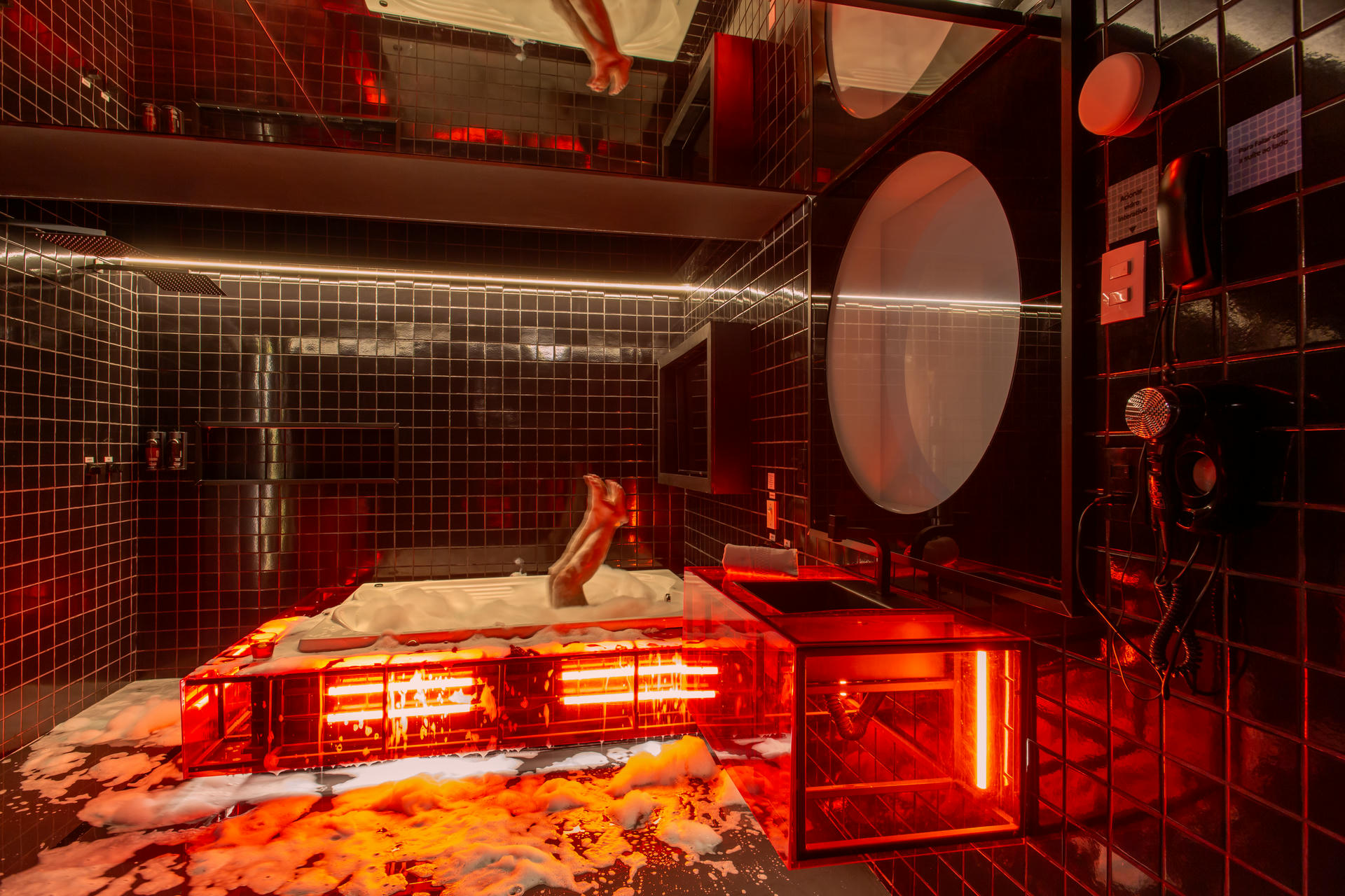 Olhando para a suíte nuu.breu você já deve ter entendido da onde o nome vem... Em nossa suíte mais completa, a escuridão não é problema quando se tem a possibilidade de um jogo de luz tão especial: aproveite todas as possibilidades de alteração da iluminação no painel da suíte, fica a dica. Lá em cima, na nossa Sala de Banho, a ideia é usufruir de todos os dispositivos: chuveiros duplos, teto solar, hidro e tv, iluminação espacial. A estética convida para o que o escuro esconde: aqui tudo é possível e te convida para viver os mais obscuros desejos. Se joga!
