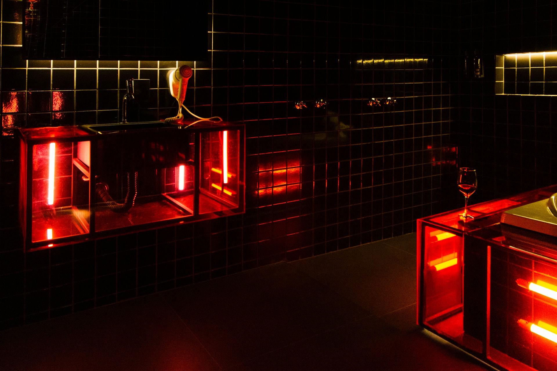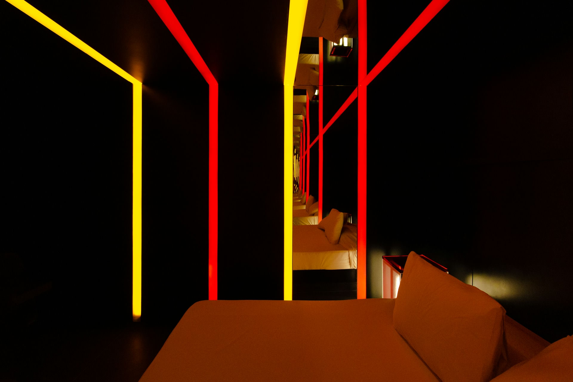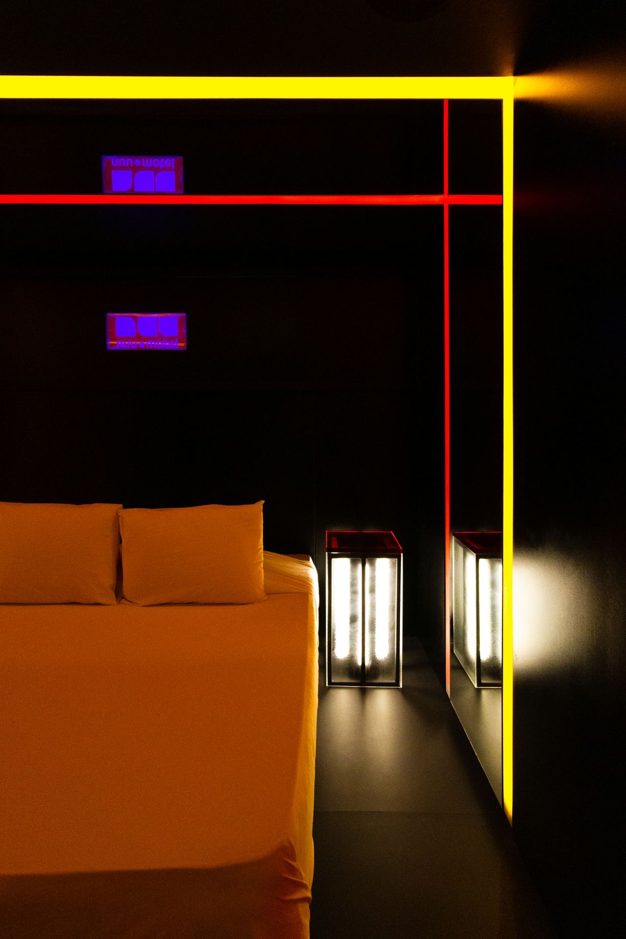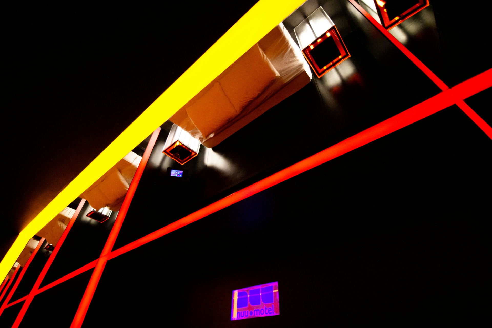 Olhando para a suíte nuu.breu você já deve ter entendido da onde o nome vem... Em nossa suíte mais completa, a escuridão não é problema quando se tem a possibilidade de um jogo de luz tão especial: aproveite todas as possibilidades de alteração da iluminação no painel da suíte, fica a dica. Lá em cima, na nossa Sala de Banho, a ideia é usufruir de todos os dispositivos: chuveiros duplos, teto solar, hidro e tv, iluminação espacial. A estética convida para o que o escuro esconde: aqui tudo é possível e te convida para viver os mais obscuros desejos. Se joga!