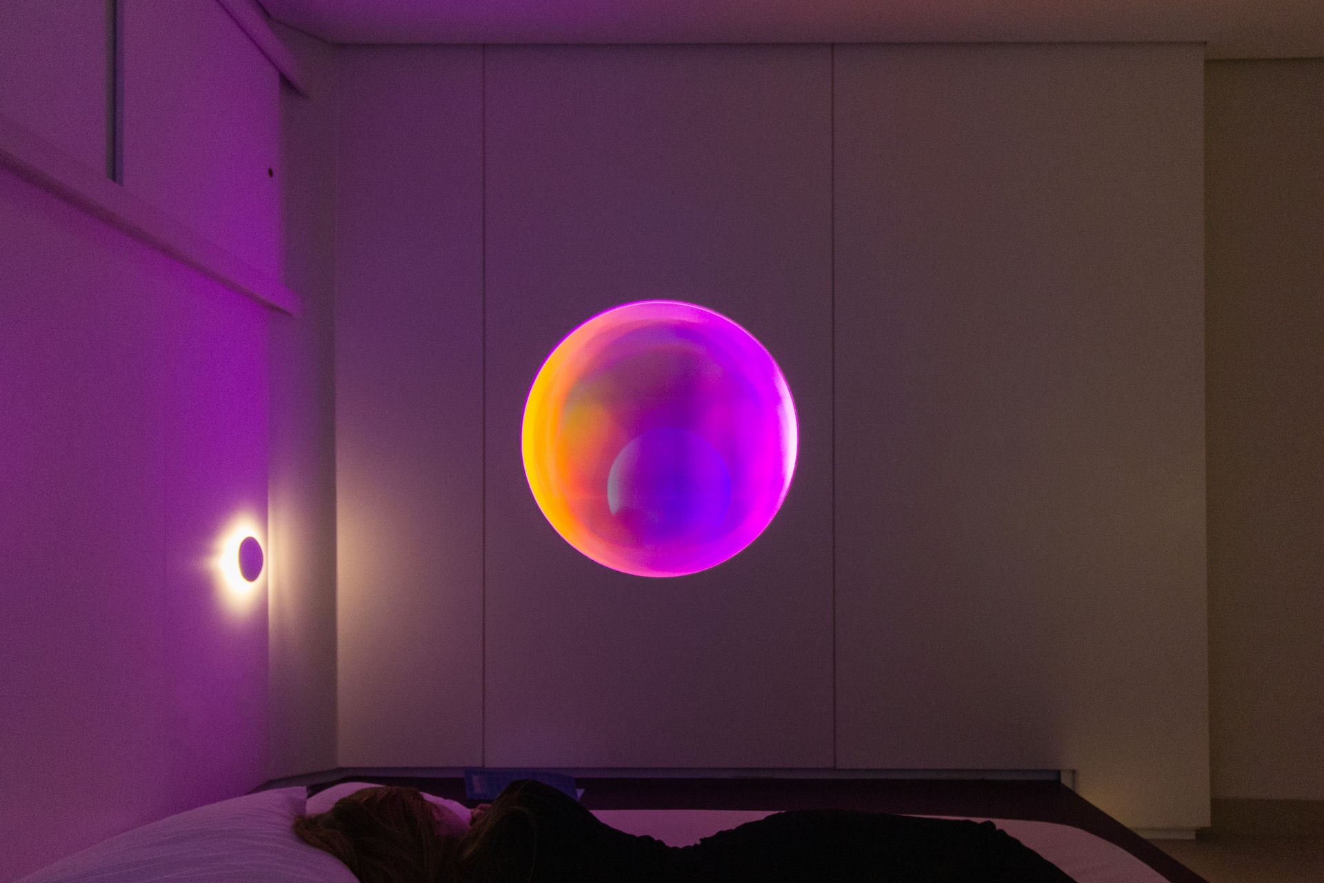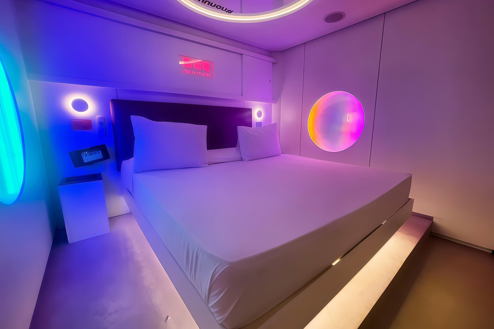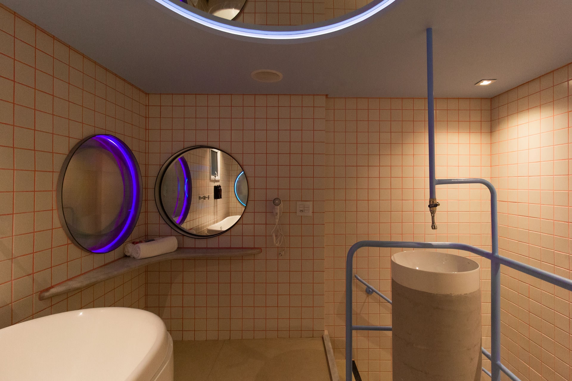 A suíte nuu.céu é toda perfeitinha. Nossa inspiração foi criar um cenário e estímulos de luzes inusitados que fossem um tanto futurista e outro tanto sensual. Buscamos referências plásticas lá no minimalismo americano, sugando o que podíamos de artistas como Dan Flavin e James Turrel. Lá em cima, na nossa Sala de Banho, temos uma banheira belíssima para ser aproveitada a dois, mas também quem sabe a um, em um dia relax. O importante é aproveitar os reflexos e todas as possibilidades de jogos de luz que o quarto oferece: não tenha medo de mexer no painel automatizado e descobrir o próprio cenário preferido.