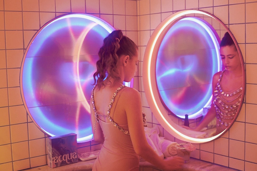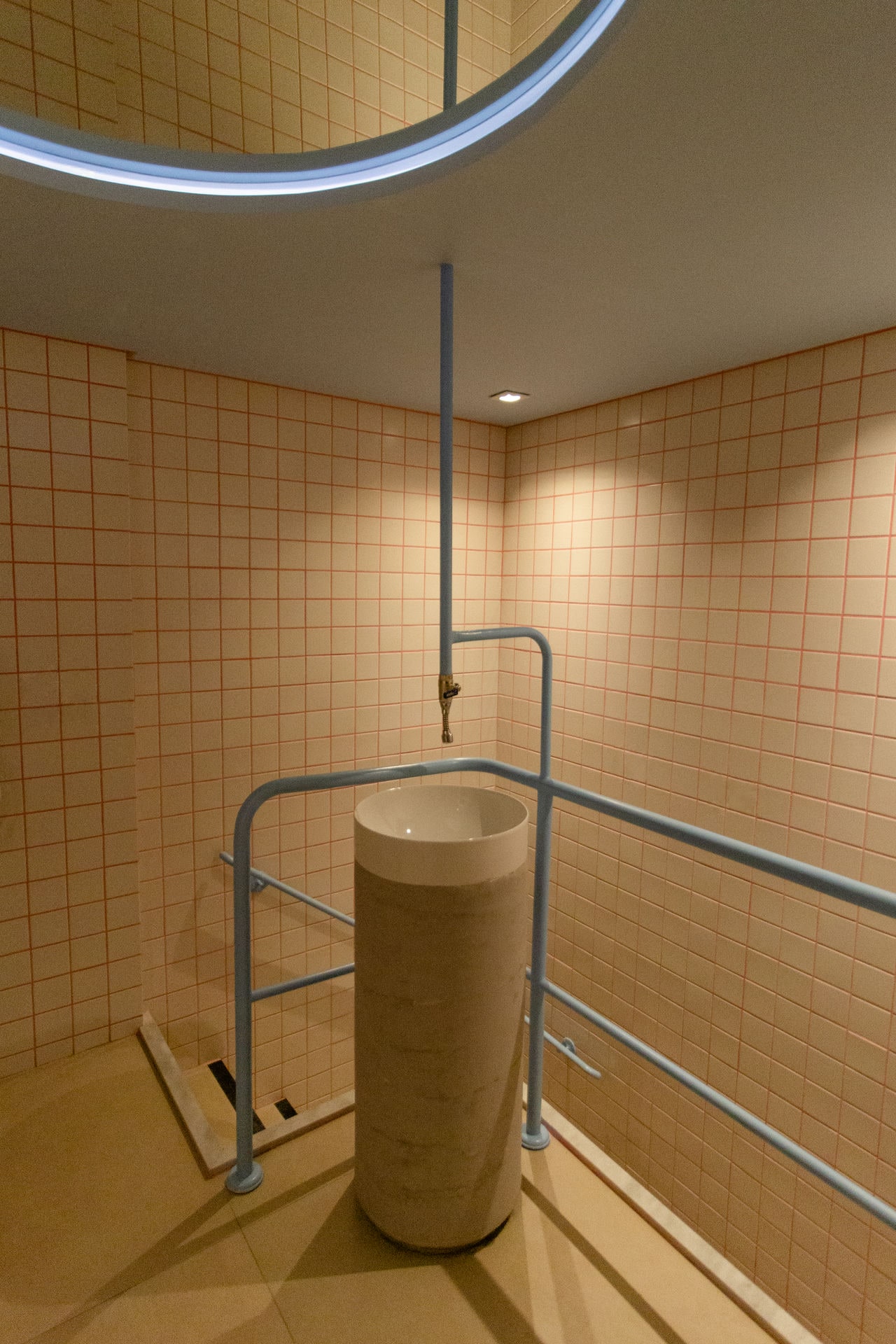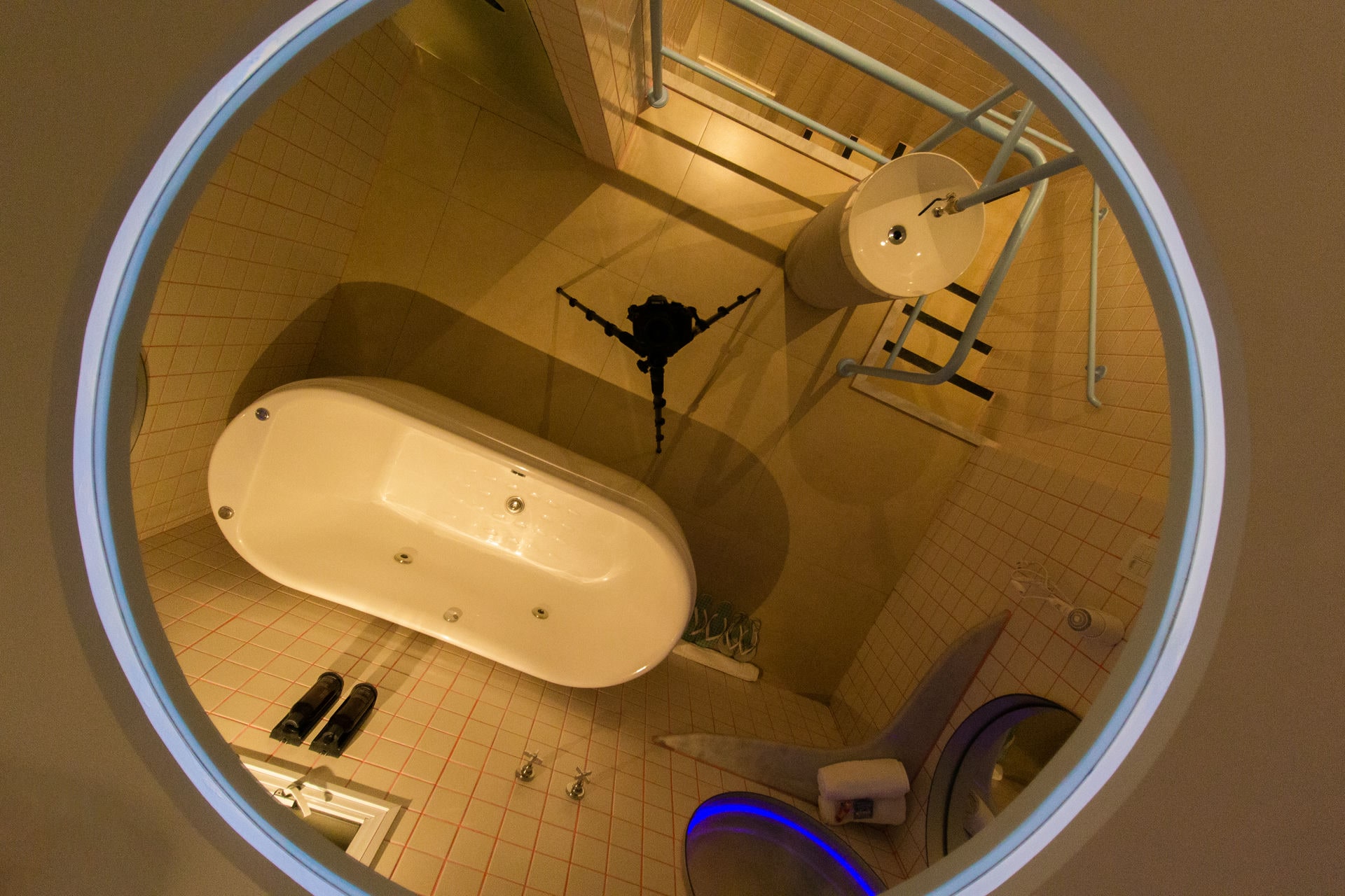 A suíte nuu.céu é toda perfeitinha. Nossa inspiração foi criar um cenário e estímulos de luzes inusitados que fossem um tanto futurista e outro tanto sensual. Buscamos referências plásticas lá no minimalismo americano, sugando o que podíamos de artistas como Dan Flavin e James Turrel. Lá em cima, na nossa Sala de Banho, temos uma banheira belíssima para ser aproveitada a dois, mas também quem sabe a um, em um dia relax. O importante é aproveitar os reflexos e todas as possibilidades de jogos de luz que o quarto oferece: não tenha medo de mexer no painel automatizado e descobrir o próprio cenário preferido.