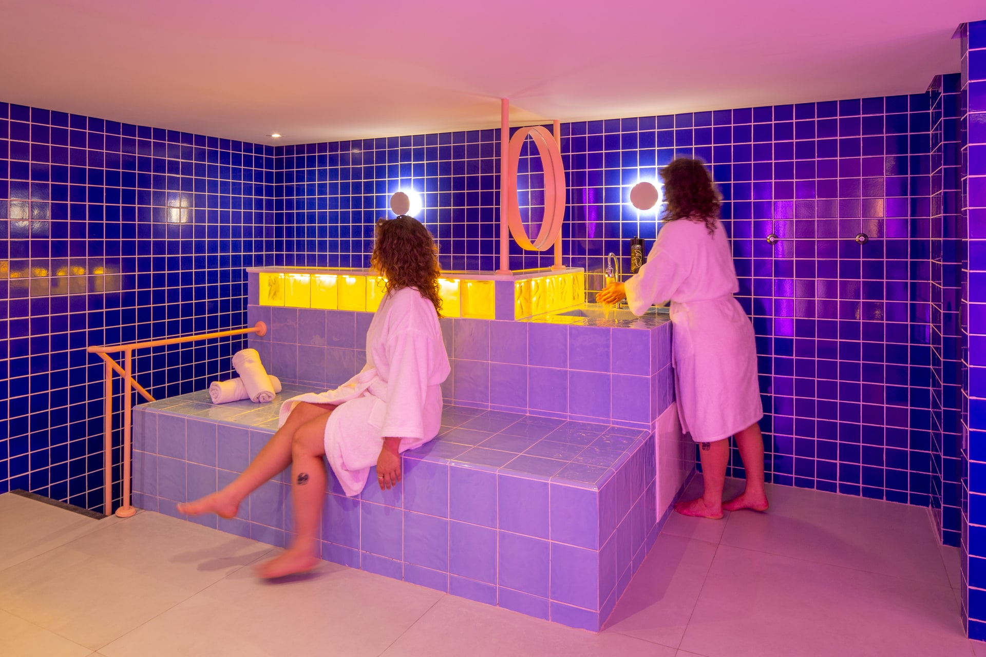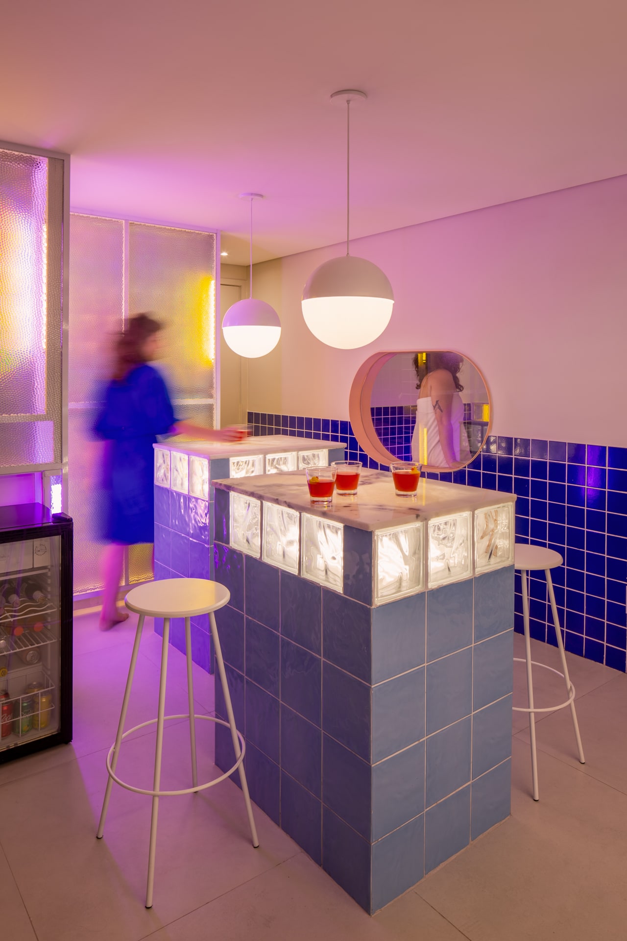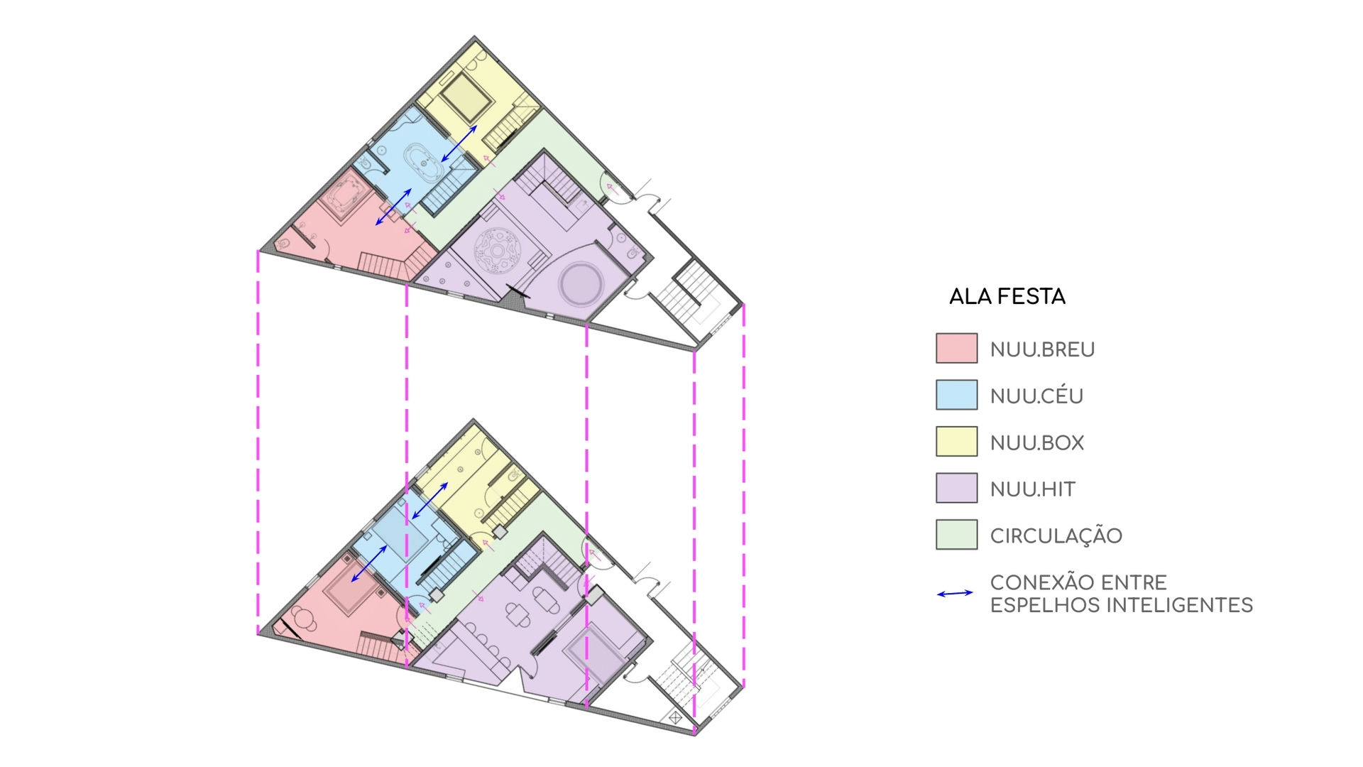 A suíte nuu.hit é o nosso grande show! A mais completa de todas do que oferecemos, aqui você vai quase se perder de tanto ambiente: temos um quarto, um bar e uma sala de banho no andar de cima completíssima: os box holes, hidro que cabe uma galera, lounge com cama redonda. São infinitas possibilidades para curtir a dois ou propor uma festinha com mais gente. Ela ainda pode ser acoplada à ala das interativas e formar um espaço pra uma festa maior.